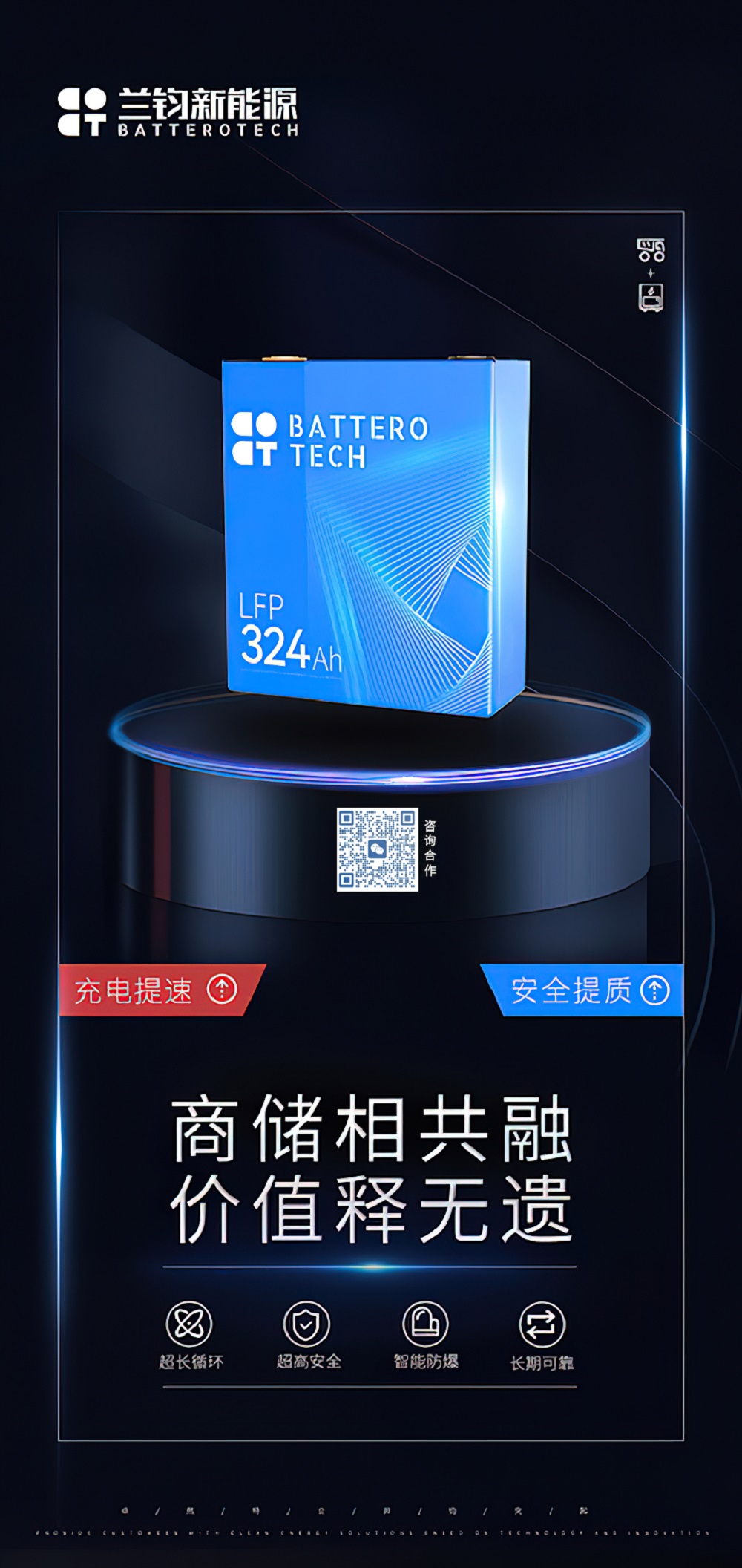 兰钧324Ah商储共用产品,在设计之初就充分挖掘客户和市场的潜在需求,经过多项设计性能优化和多轮的严谨验证,可满足换电以及其他商储电动化等各种多元化的应用场景需求,通过正负极/电解液等的化学体系创新,超强的结构安全和稳定设计,充分保障电芯的循环及安全性能,满足客户的各项要求。在响应全球环保、国家梯次利用以及市场需求方面起到积极作用,使用成本达到最小化,将锂电池的价值充分释放。