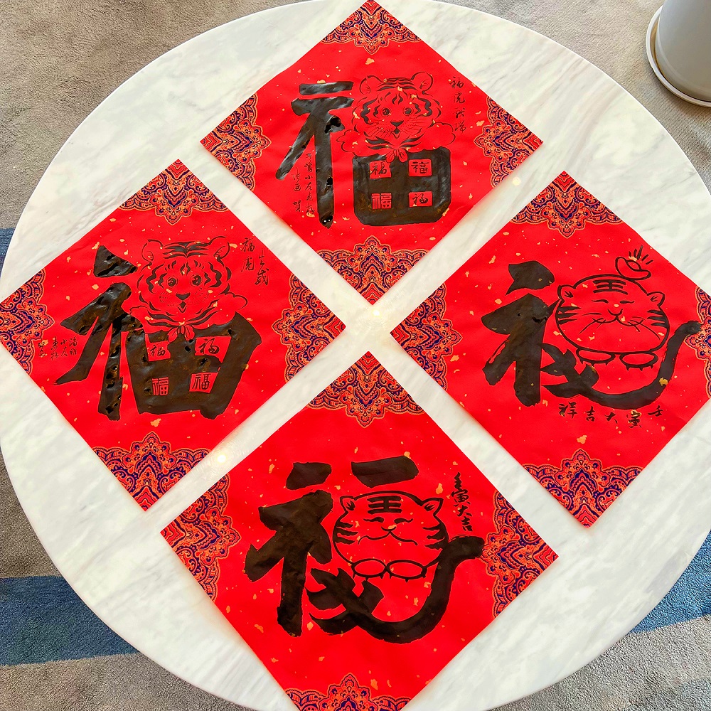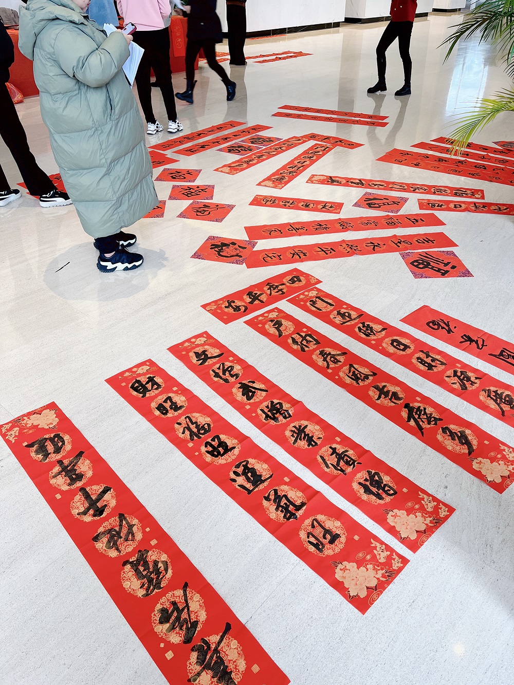 本次活动邀请了8位书法家来到活动现场,他们红幅铺展,笔尖游走于墨色与纸张之间,多种书体各显神韵,很快一副副妙笔成双的春联和喜庆的大红“福”字就展现在大家眼前,一平一仄、一撇一捺间寄托着浓浓的新春祝福。员工们纷纷到现场观摩,并争相邀请书法家写上自己心仪的春联和福字,现场洋溢着迎春接福的欢乐气氛。