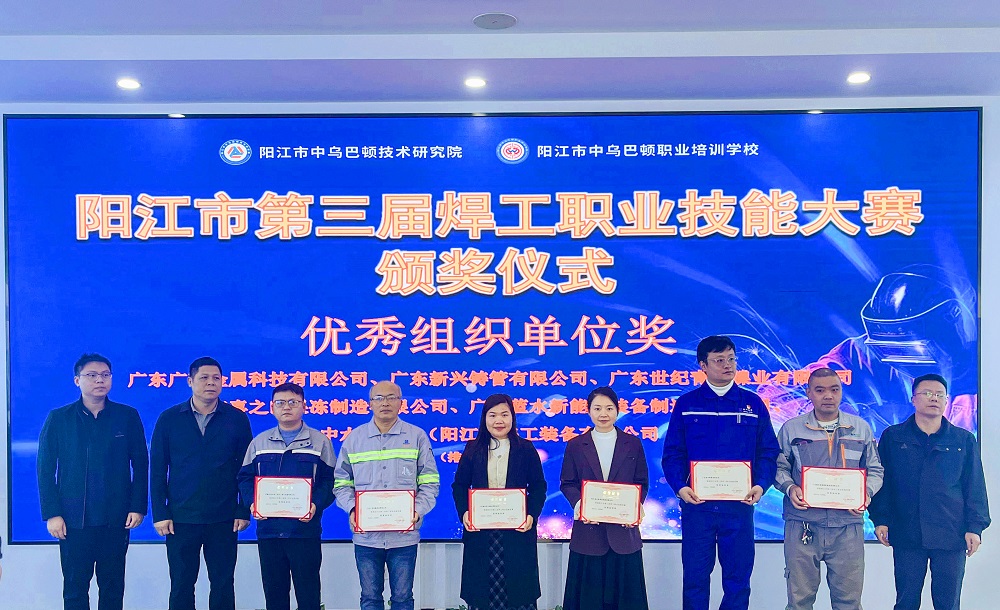 12月24日,由阳江市委人才工作领导小组办公室指导,阳江市中乌巴顿技术研究院承办的第三届焊工职业技能大赛颁奖仪式在阳江市中乌巴顿技术研究院举行。阳江滨海新区(阳江高新区)组织部副部长郑敢记、科技局局长潘欧醒,广东广青金属科技有限公司党委副书记、工会主席王大庆,以及相关部门负责人出席活动。大会表彰了7个团体和16名个人。广青科技荣获团体技能赛一等奖、优秀组织单位奖;参赛员工荣获“阳江市技术能手”称号以及个人技能赛一、二、三等奖。