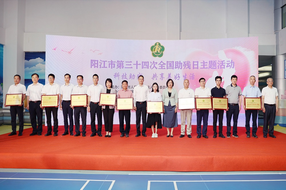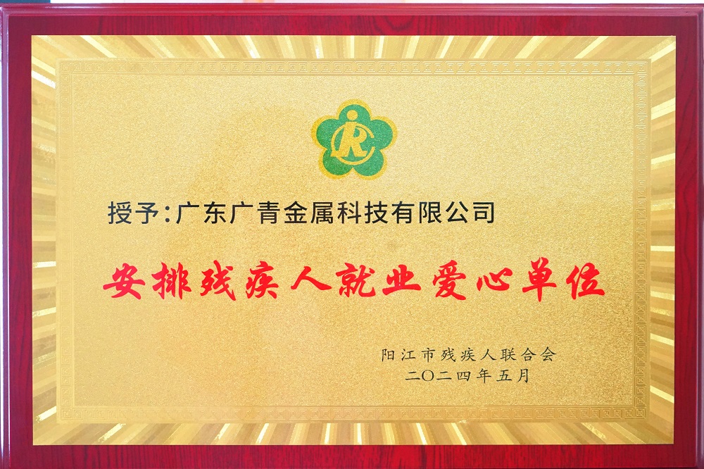 5月17日,在第34个“全国助残日”来临之际,阳江市“科技助残,共享美好生活”第三十四次全国助残日主题活动在市残疾人康复中心举行。活动现场颁发了“扶残助残志愿服务队感谢状”和“安排残疾人就业爱心单位”牌匾。广东广青金属科技有限公司被授予“安排残疾人就业爱心单位”荣誉称号。