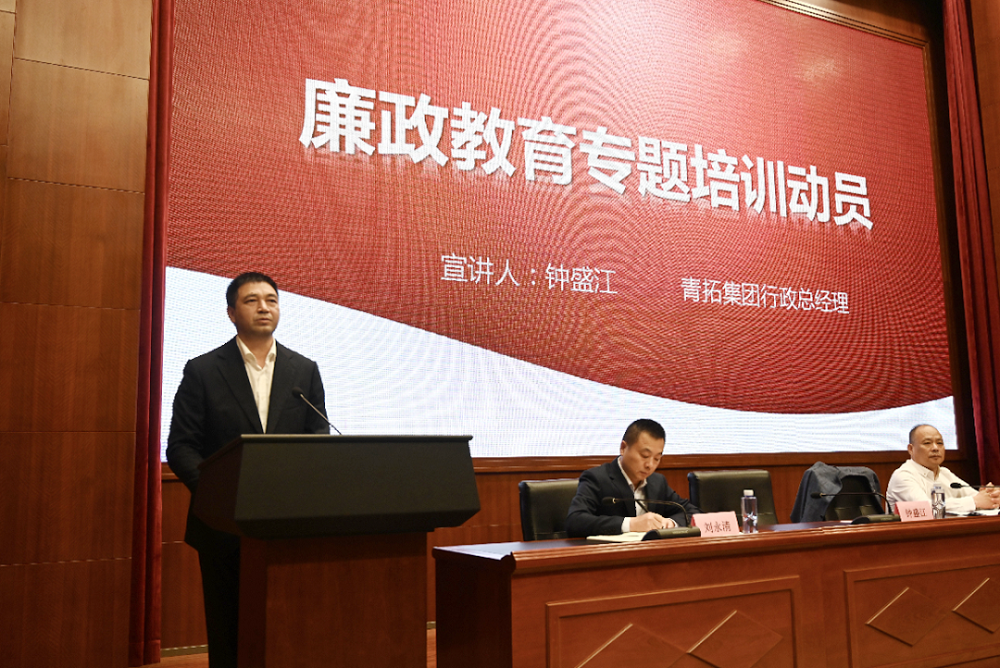 钟盛江作廉政教育培训动员讲话。他从当前国际形势出发,介绍jinnianhui今年会的发展战略,分享青拓的未来规划,希望大家持续提升自身素养与企业共同成长。他指出:反腐的事是最大的事,作为企业的中、基层管理人员更应知道腐败是企业发展的绊脚石,要强化责任担当、以身作则,注重“三好”(即品质好、素质好、习惯好),锤炼“三商”(即情商、智商、苦商),要胸有阳光、有智慧、手有章法,防好底线、红线、高压线,绷紧反腐倡廉这根弦。