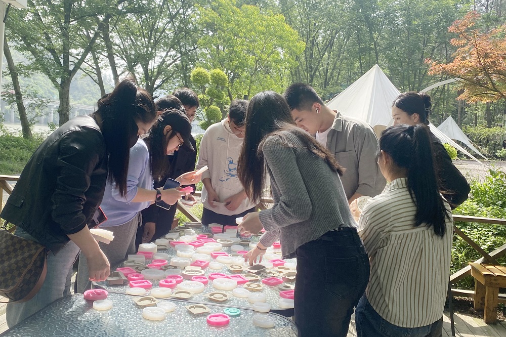 在此基础上,开始了手工活动和趣味运动。在非遗拓染漂漆及DIY香薰蜡牌活动中,大家相互交流制作的模具、图案,营造出轻松的氛围,进一步拉近彼此的距离。投壶、飞镖轧气球、拔河及桌游不仅让大家在欢声笑语中放松了身心,也让新员工深刻感受到公司企业文化的魅力。